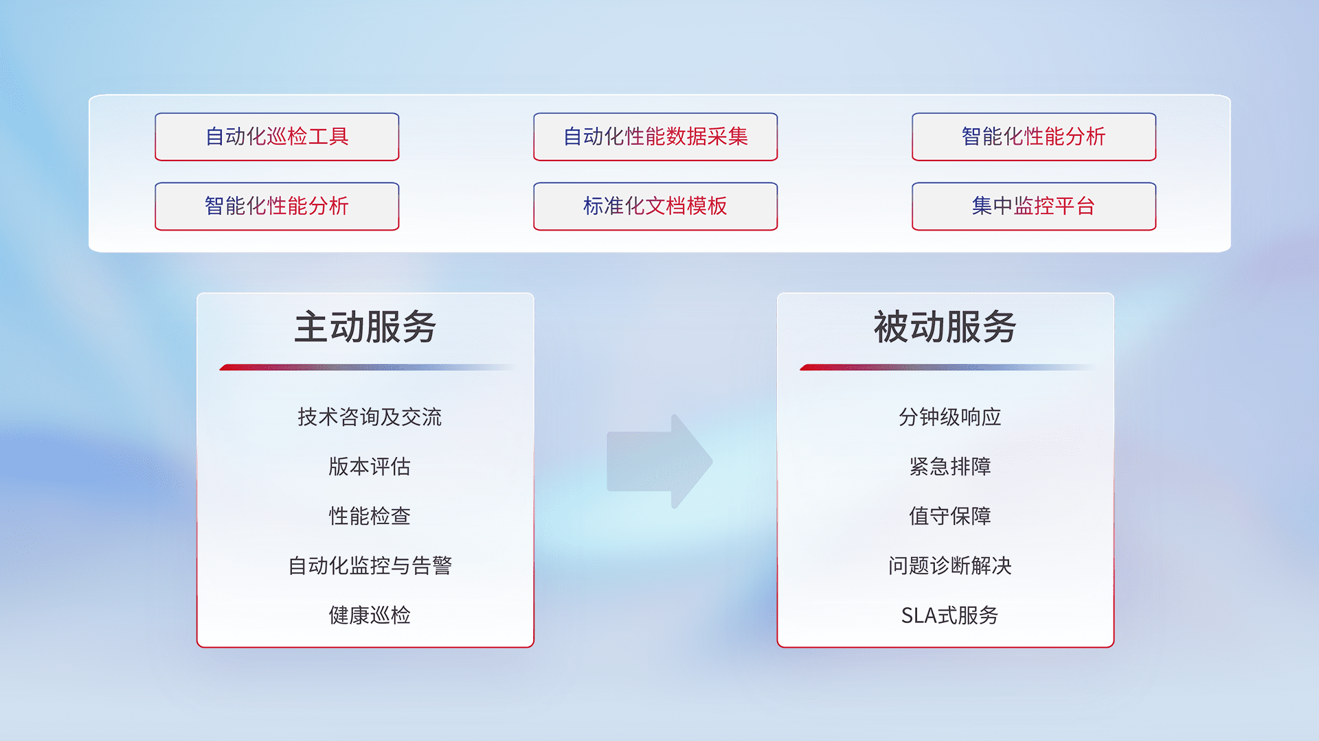 智能化工具和标准化文档,,保障服务质量,,,提供主动服务(包含技术咨询、、版本评估、、性能检查、、、自动化监控与告警、、健康巡检)和被动服务包含(分钟级响应、、、紧急排障、、值守保障、、、、问题诊断解决、、SLA服务)。。